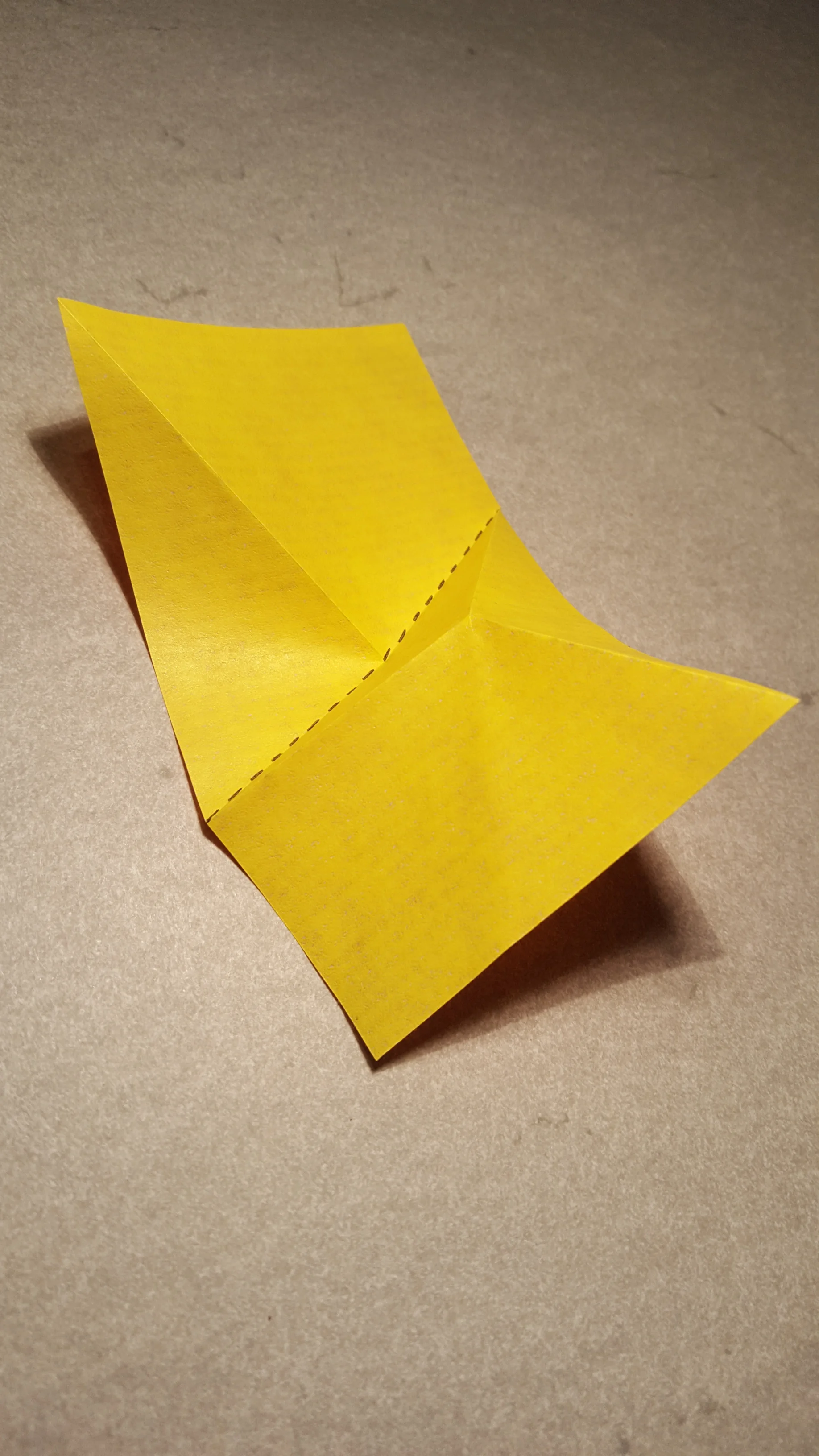 Turn over the paper and begin to shape all of the folds we have made so far. The middle part of the main diagonal fold will have to become a velley.